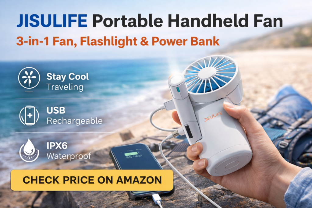| JISULIFE Portable Fan | Travel & summer | Fan + power bank + flashlight | Check Price on Amazon |